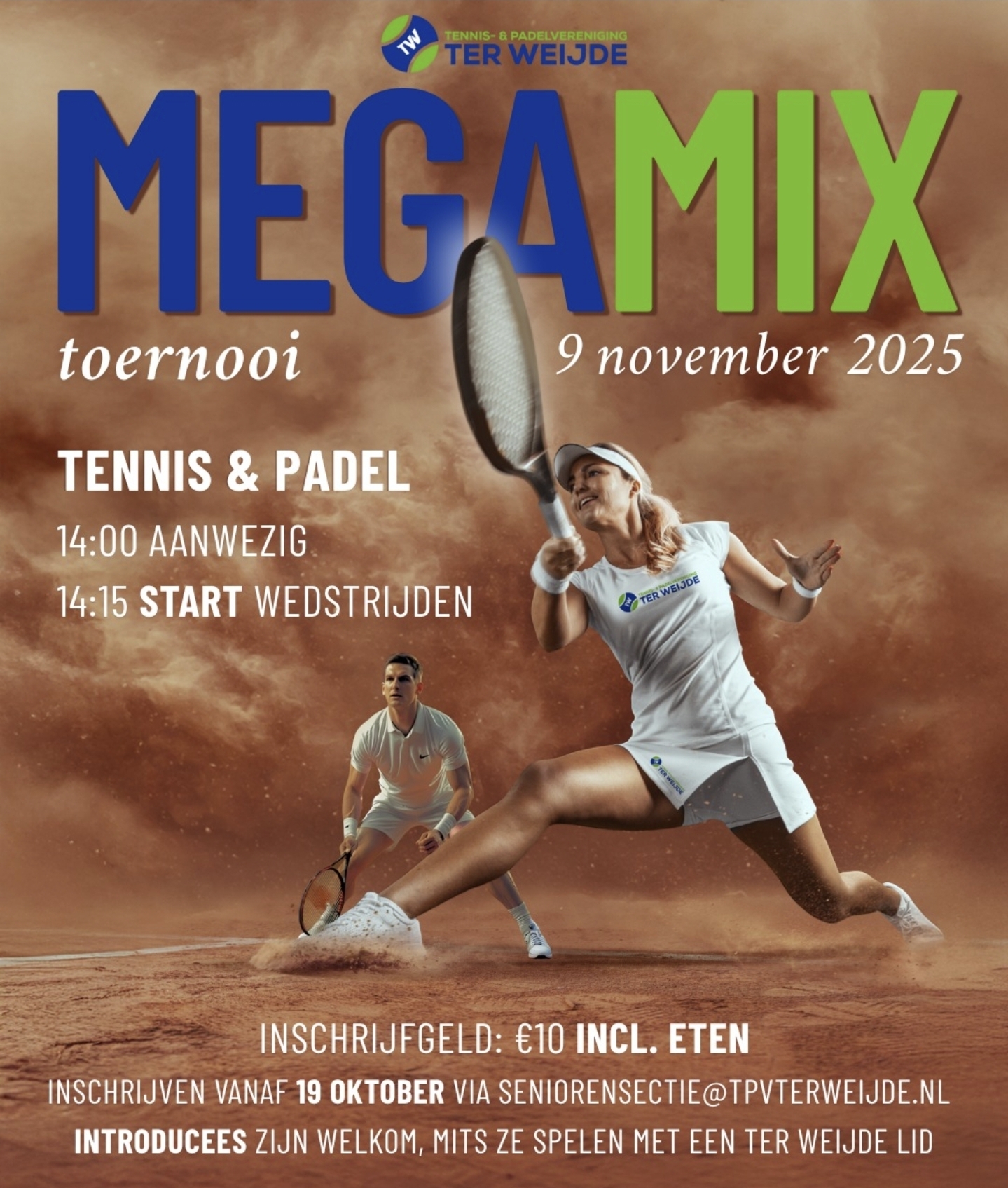 Het gezelligste toernooi van het jaar staat weer voor de deur. Op zondag 9 november vindt het mega mixtoernooi plaats, voor zowel tennis als padel. Er kunnen deze dag 24 koppels tennissen en 8 koppels padellen, dus wacht niet met inschrijven! HD, DD en GD is mogelijk alleen "mixen" we wel gezellig met z'n allen.