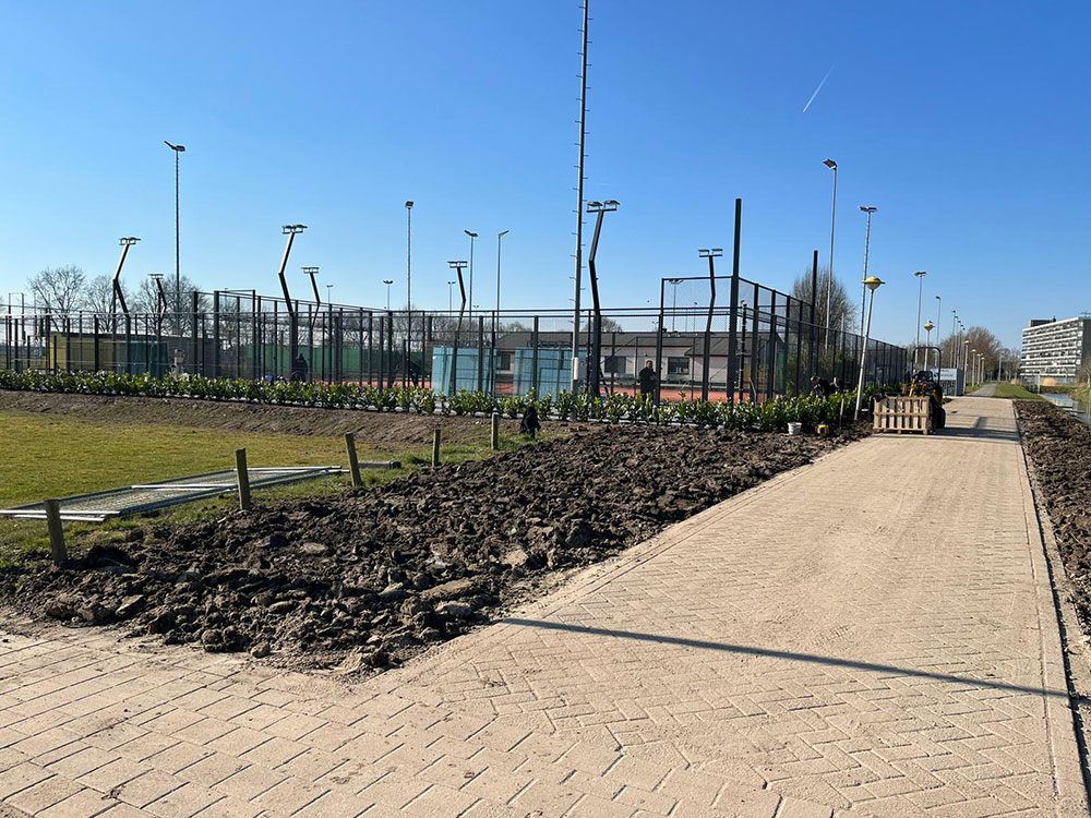 Per direct is de “normale” entree weer beschikbaar. Het toegangspad is (vanwege de nieuwe padelbanen) een paar meter opgeschoven en dus volledig nieuw bestraat. Het pad ligt er weer strak bij.